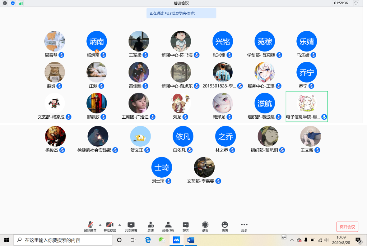 为更好的开展学生会的各项工作,满足学院改革发展的需要,成人app 团委学生会本着自我教育、自我管理、自我服务的原则,于820日召开2020-2021学年部门改革讨论与工作安排线上会议,讨论了新学年各部门工作规划与发展构想并提出了创新性意见与建议,力争在新学年做到以正确的方向引导人,以健全的制度塑造人,以丰富的活动锻炼人,以优质的工作服务人。参会人员包括成人app 团委书记樊晔、团委副书记刘畅、学生会主席杨炳南、服务中心主任贺文正、学生会副主席广浩江、赵炎,团委学生会各部部长干部。