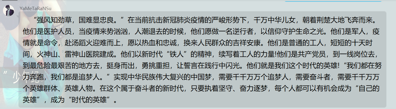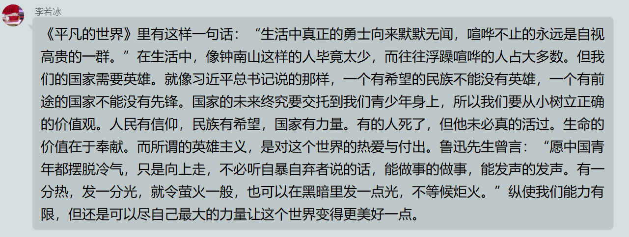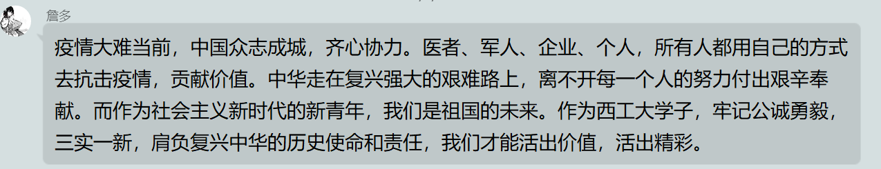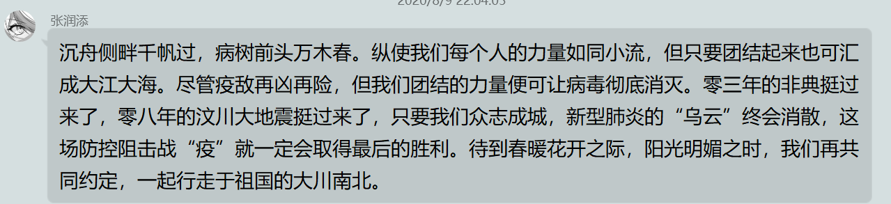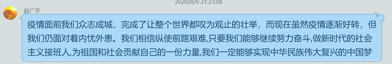 这次的“众志成城抗击疫情,感悟传承中国力量”暑期线上社会实践活动中,我们学习了习近平总书记的讲话精神,了解环境保护的重要性,感受无私奉献艰苦创业的传承;我们调研疫情期间群众们的生活、企业复工的情况,看到了个人与社会在国家陷入困境时的责任与担当;我们了解抗疫的榜样人物,看那些感人的故事,并感受那些崇高的精神。我们作为当代青年,是祖国繁荣复兴的支柱和动力,深刻感受我们的使命和担当,只有自强不息、艰苦奋斗,才能更好地为祖国做出贡献,成为有责任有担当的新青年。
