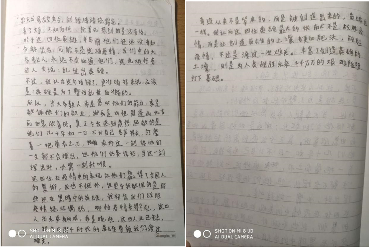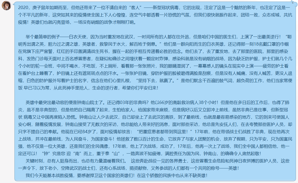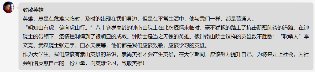早在2003,钟南山院士作为中国抗击非典型肺炎的领军人物,SARS猖獗的非常时期,不但始终在医疗最前线救死扶伤,还积极奔赴各疫区指导开展医疗工作,倡导与国际卫生组织之间的密切合作。在这次抗击新型冠状病毒中,84岁高龄的钟老依然冲在第一线,在疫情面前临危不乱,在疫情期间给人们吃了一剂定心丸,获得了人民的绝对信任,这是人民心中的大英雄!作为大学生,尽管我们的力量薄弱,但只要做到自己的本职,保证学业不下滑,其次尽到社会责任如帮助中小学生辅导功课,做好网络舆情监督与舆论引导等,我们依然是这场战“疫”中的小英雄!