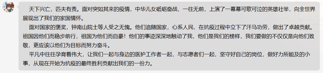面对疫情,中国人民团结一心,积极响应国家的号召,共同坚守,驱逐病魔。在这场大考中我们看到了中国力量:全国上下众志成城,同舟共济,精准施策,形成了强大合力,打响了这场疫情防控人民战争、总体战、阻击战;科研人员攻坚克难,医护人员坚守担当,志愿者们无私奉献,他们每一个都是英雄,他们的勇敢无私值得我们崇敬。在这场战大考中,我们每个人都是答卷人。无论来自何地、无论身处何方,既是休戚与共的命运共同体,也是责任共同体,每个人都是一道防线。任何困难都难不倒英雄的中国人民,此次疫情得以控制也再次印证了这句话的正确,在深感自豪的同时,身为青年的我们更应树立远大理想,奋发图强。我们要坚定信念,把自己的理想同祖国的前途、民族的命运紧密联系在一起,扎根基层、奉献国家,在逐梦路上脚踏实地、行稳致远。