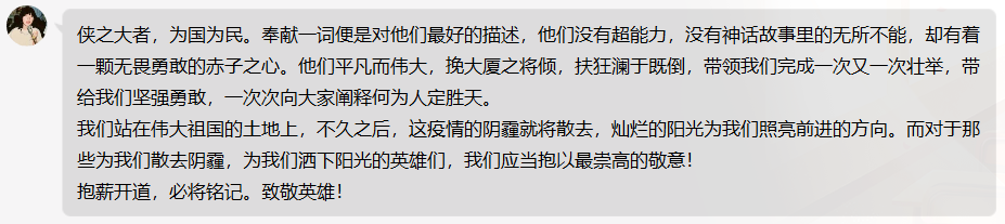 说起英雄,我最初想到的是战争年代与外敌顽强拼搏的烈士。在新世纪的和平年代,有越来越多的领域中涌现出来了不同的英雄,虽然没有战争中的拼杀那么血腥,直接,但也总逃不开奉献与牺牲这两个字。此次与新冠病毒的斗争,就是一场医学与生物领域的战争,他们为国奉献,挽救生命,是我一生值得学习的对象。