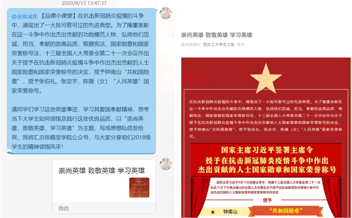 为了鼓励大家学习在抗击新冠肺炎疫情的斗争中所涌现出的先进典型,成人app 2018级本科F1岗辅导员樊晔开设了一期【品德小课堂】。“品德小课堂”是成人app “1+5+X”的学生价值塑造培养体系中的举措之一,教育引导学生坚定理想信念、厚植爱国主义情怀、加强品德修养、增长知识见识、培养奋斗精神、增强综合素质,努力培养德智体美劳全面发展的社会主义建设者和接班人。本期“品德小课堂”带领同学们学习在抗击新冠肺炎疫情的斗争中的英雄事迹,学习其爱国奉献精神,并引导学生思考当下大学生如何领悟及践行这些优良品质。