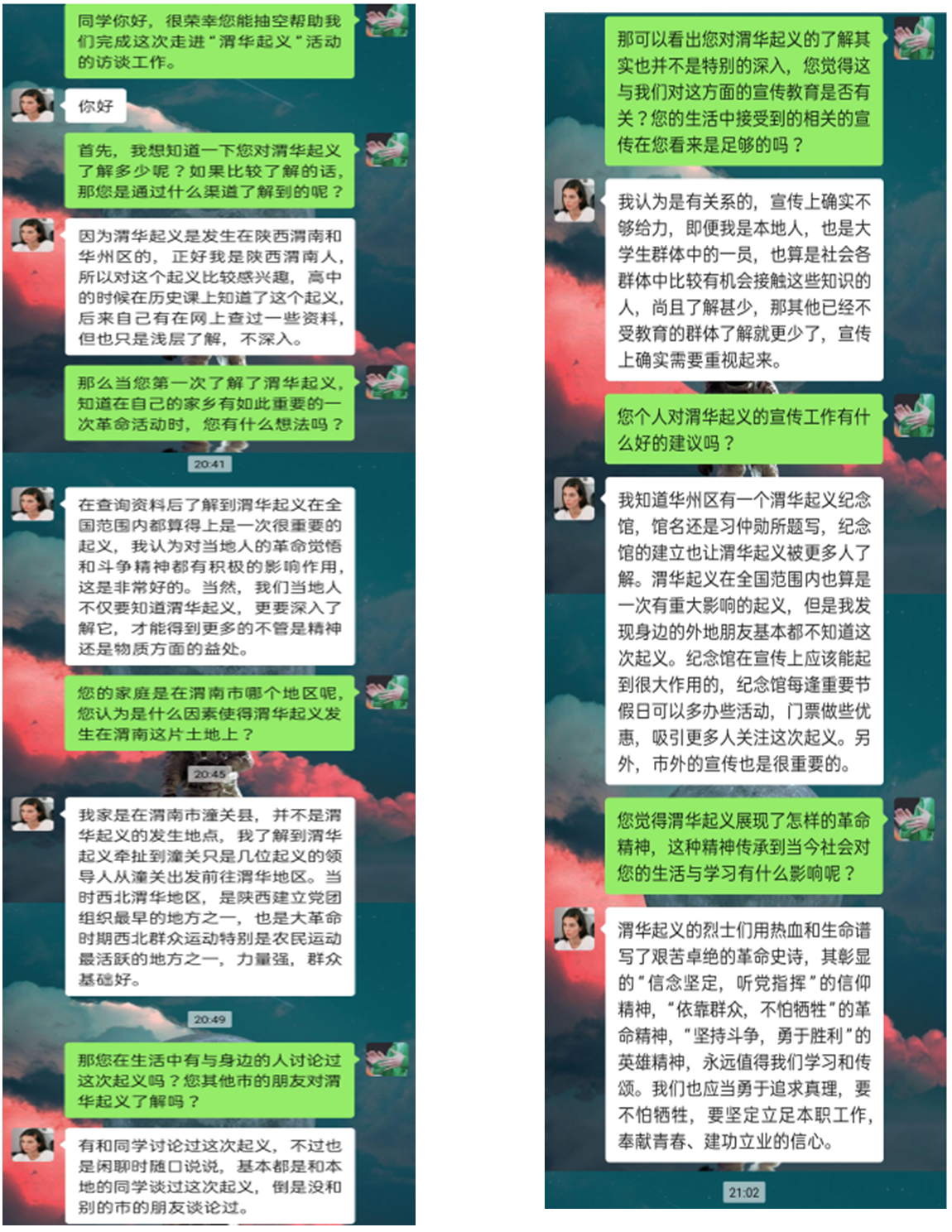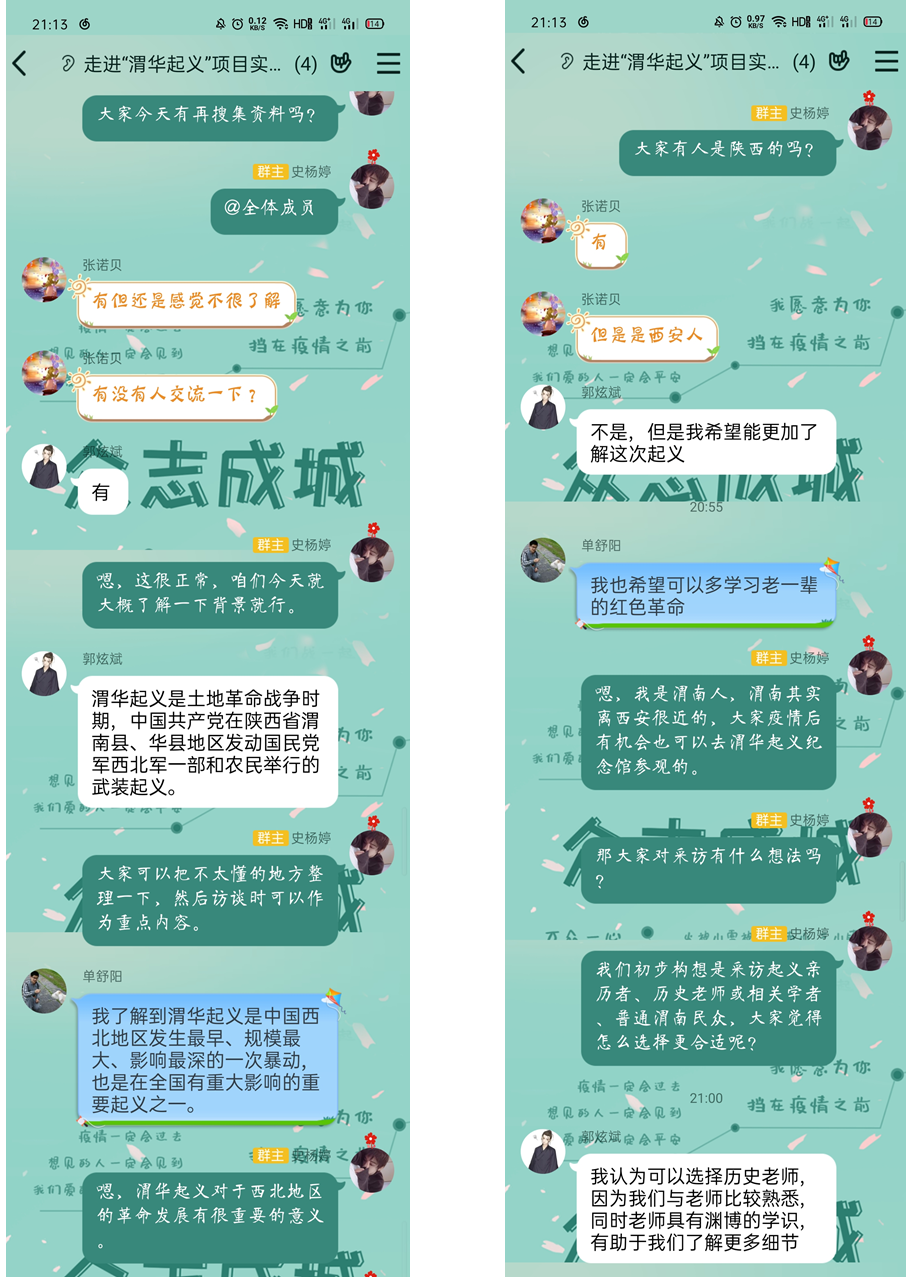 实践小队在这场短暂的社会实践中感受颇深。小队将整个活动分为三个部分:第一部分是对渭华起义文献和影视资料的收集与学习。第二部分便是我们的线上采访阶段了,一味地学习书本,到头来不过是“纸上谈兵”,“纸上得来终觉浅,绝知此事要躬行”,通过询问当地居民和老师,参观渭华起义的纪念馆,才能切身体会到革命先烈当时不屈的斗志与坚定的信念,燃起我们的敬佩之心。第三部分就是数据收集部分,通过线上问卷的形式收集足够的数据,在大范围上了解大学生对渭华起义的了解程度。最后总结和回顾实践中的收获与感受。