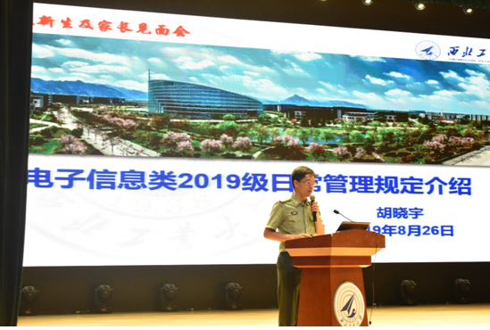 最后,2019级新生辅导员代表胡晓宇老师为大家做了学生日常管理规定的介绍,胡晓宇老师首先从学生的权利与义务讲起,向全体新生及家长明确了学生在校学习期间的权利及义务;接着做了学生违纪及相关处分的说明,并着重强调了部分常见违纪违规行为及学生公寓管理相关规定;最后向全体新生详细介绍了三位辅导员老师,并提出了日常管理要求,如早签到晚自习制度、请销假制度等。学校及学院完善详细的管理制度、强大的学生工作队伍等为学生们的成长成才提供了重要保障,给学生和家长们吃了一颗定心丸。
