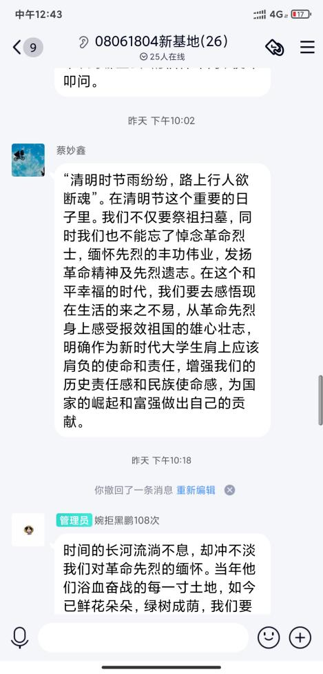 电信四班以“学党史 祭英烈 悟思想”为主题开展了线上学习教育活动,观看了“清明祭英烈,共铸中华魂”和“致敬!铭记于心的人”两个主题视频。同学积极学习活动内容,踊跃发表学习感悟。