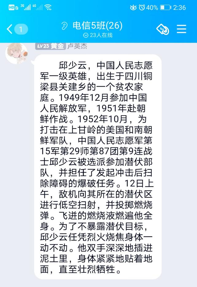 电信五班的同学们以线上QQ群的形式组织了先烈故事分享会,卢英杰、周扬、陈蕊、朱潜等同学分别分享了邱少云、赵一曼、刘胡兰、董存瑞等先烈们的英勇事迹,与同学们一起缅怀先烈寄托哀思。同学们学习先烈们的优秀品质,努力传承英雄精神,更加珍惜现在的美好生活。