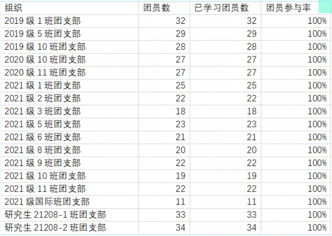 青年大学习保持参与人数全校第一,共有17个班级支部学习完成率达100%,在此对这些团支部提出表扬!
