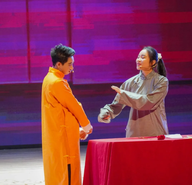 随后,管理学院带来了相声《我要当女生》,两位同学凭借着幽默的语言,超高的表演水平,默契的配合,为所有观众带来了无尽的欢乐,将本场迎新晚会再一次推向了高潮!相信看过的同学一定还记得当时的扭捏和疯狂!放飞自我,欢乐把握!