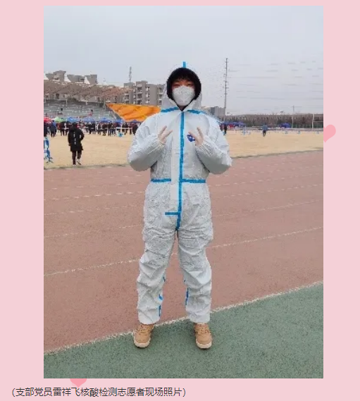 雷祥飞同志参与了云天苑操场的核酸检测活动,他感慨道:作为一名党员,这次终于有机会站在防疫一线,贡献出自己的微薄之力。这次疫情让我体验到的不仅仅是冬日的严寒,更有人性的温暖。每当我看到大家都努力坚守在岗位上,每当我想到医护人员拖着疲惫的身子仍然在坚持着工作,我真切地体会到,是他们的负重前行,才有了我们幸福的生活。作为新时代大学生党员,我们要肩负起历史和时代赋予的使命,在担当中历练,在尽责中成长。