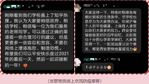 同时,支部也开展了热烈的讨论。支部书记樊晔鼓励同学们在这次艰难的抗疫时刻,充分发挥党员的模范带头作用,外能参加志愿服务,内能安定同学人心,共同搭建抗疫稳定堡垒。支部副书记刘崇辉同志提出这次疫情是对大家的考验,身为党员更应该提高自己的政治站位,体现自己的大局意识和底线思维,在保证自己安全前提下,以身作则、带头向前,打赢这场疫情防控阻击战。王鹏同志号召各位党员保持理性、发挥共产党员艰苦奋斗的优良品质;雷祥飞同志鼓励各位同学以一个包容的心态去面对疫情下的种种问题,不信谣不传谣;16级党员何亦湘同志虽远在外地,也在线上鼓励学弟学妹们克服困难,十分牵挂西安及母校的抗疫实时情况。