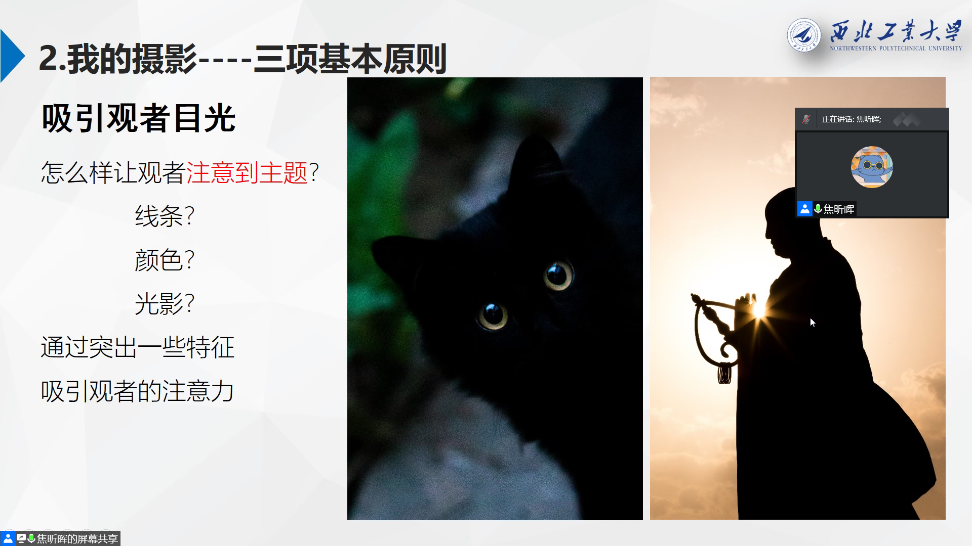 2020级博士生焦昕晖。在本期微拓活动中,焦昕晖分享了自己在科研和生活的经历与收获,还结合自己对摄影的理解,通过实际例子介绍了如何拍摄一张具有美感的照片、如何利用镜头捕捉校园内外的精彩瞬间,并讨论了图画与摄影艺术之间的相互关系。焦昕晖的分享激发了大家对摄影的兴趣,同学们纷纷表示受益匪浅。