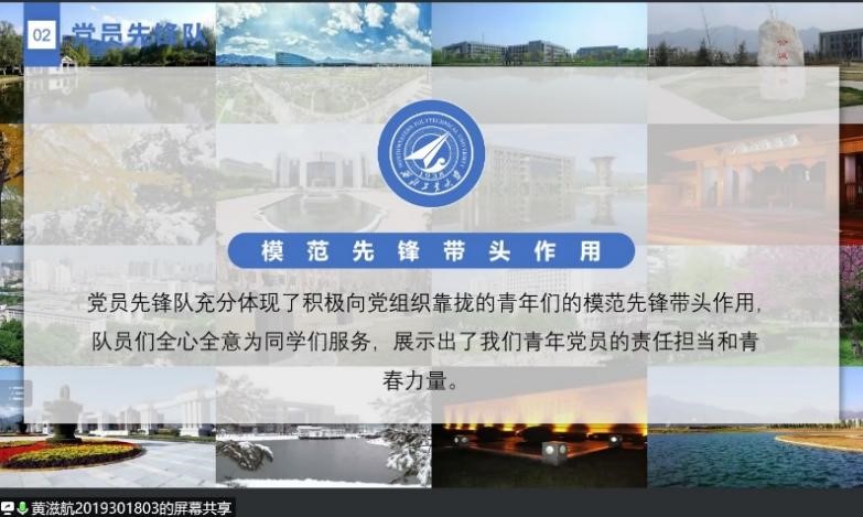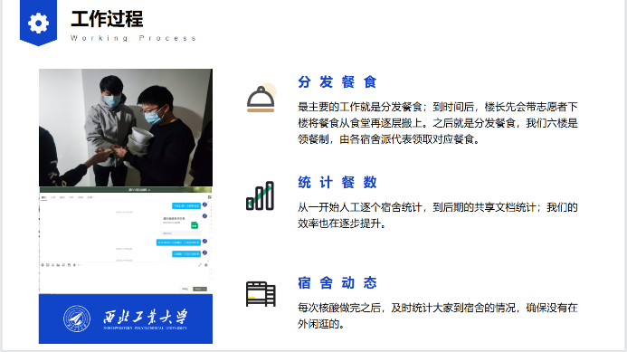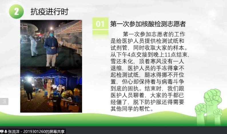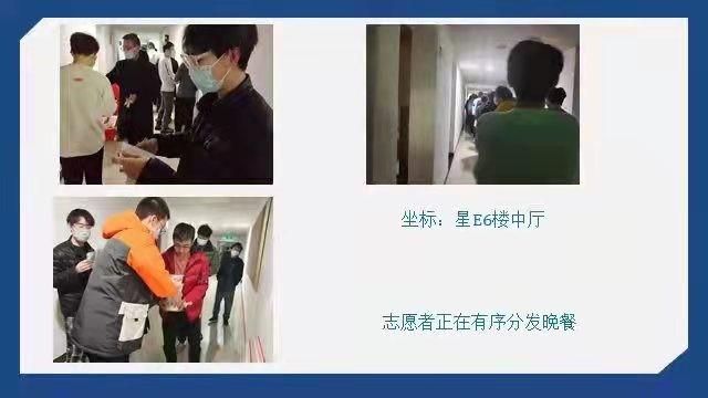 大班会还邀请了本年级七名志愿者同学就本次疫情期间参与志愿服务的心得体会进行分享交流。黄滋航同学担任星E党员先锋队的队长,他向大家介绍了党员先锋队的人员组成和工作流程,展现了青年党员的责任担当与青春力量。蔡旭东、李陆、史磊和王旭辰等同学分别作为星天苑E座及云天苑B座的楼长代表,分享了他们的抗疫初心、工作职责以及所思、所想、所得。张流洋同学作为核酸检测志愿者和十四运旗阵方队志愿者,让同学们看到了逆行者们的努力与辛苦。兼职辅导员陈忍作为宿舍管理工作团队成员,在分享自己心得的同时,希望同学们能积极配合志愿者的工作,并且主动参与到志愿服务当中。