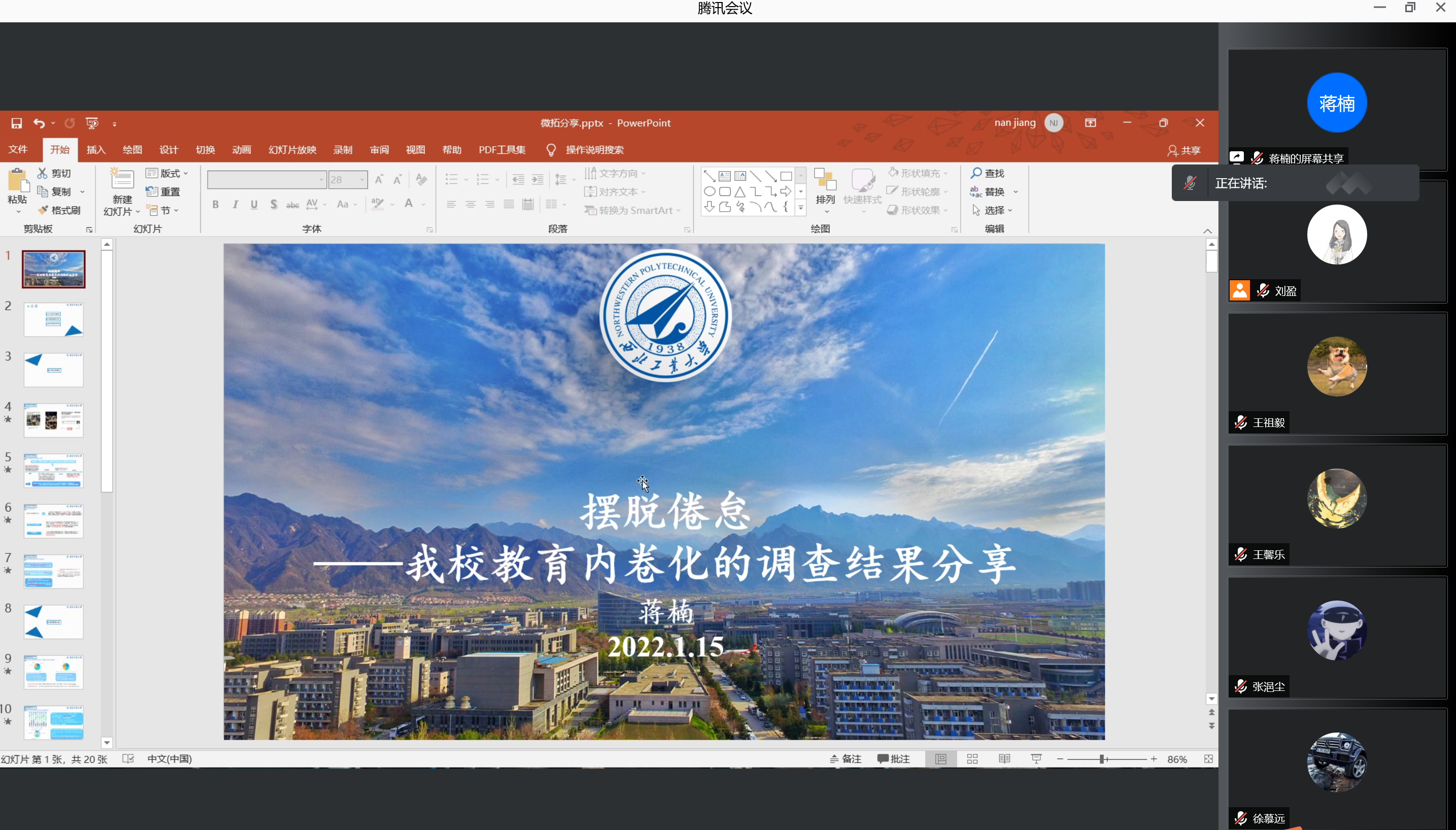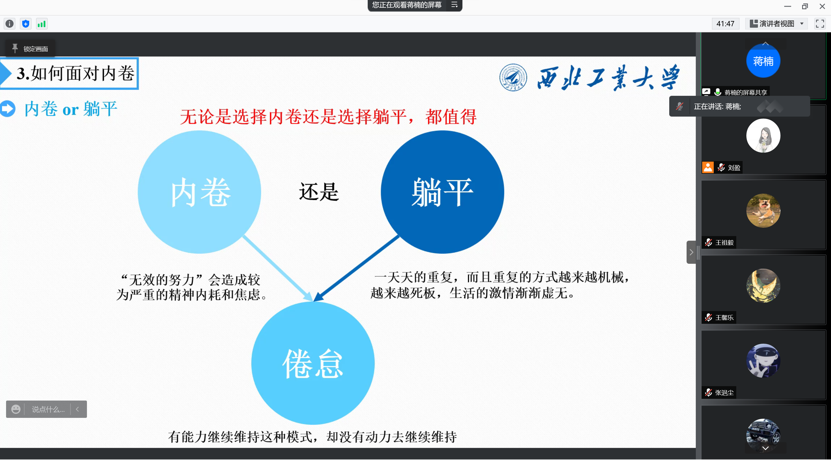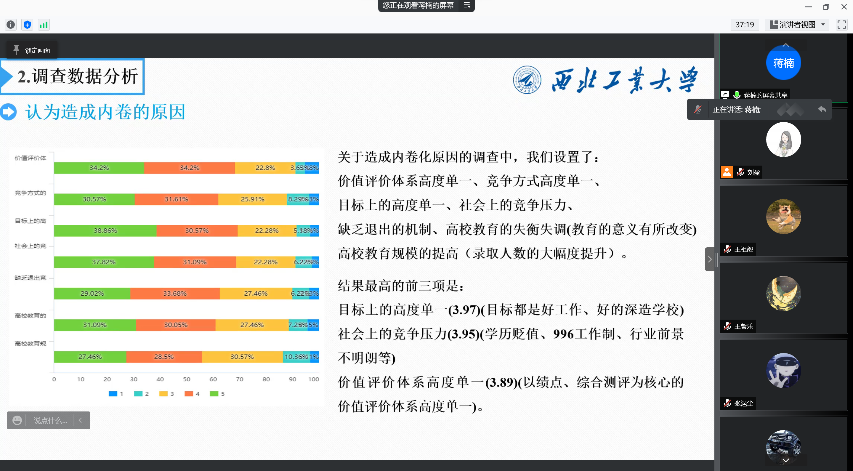 探测制导与控制技术专业2019级本科生蒋楠。蒋楠首先以内卷的来源与发展、内卷的涵义和概念为出发点,向大家详细地介绍了内卷这一现象。随后,通过其参与的一项关于内卷化的调查,他向大家分享了我校内卷化现象的调研结果。同时,对于如何应对内卷、摆脱倦怠,蒋楠提出了自己的独到见解,使大家受益匪浅。