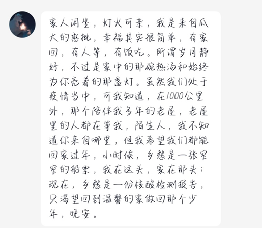 由于疫情加剧,12月23日西安市进入封闭管理。政策的变化让西工大的同学们陷入对未知的迷茫中。此时,“互助文档”的出现,缓解了同学们对物资供应的不安;“晚安计划”的出现,更是抚慰了同学们焦躁不安的心情。为此,成人app