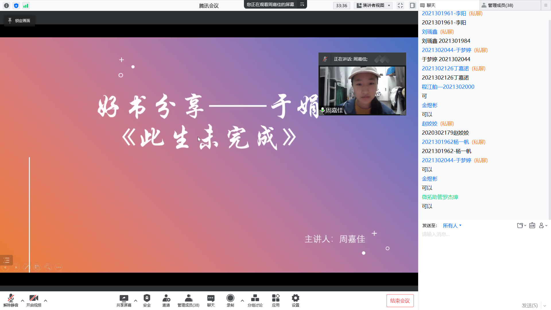 415日晚上,由我校党委学工部主办,成人app 承办的微拓”-WE TALK学术沙龙第150期通过线上会议的形式举行。本次活动主题为“好书分享—于娟《此生未完成》”,主讲人周嘉佳是成人app 2020级本科生,曾获国家励志奖学金、校二等奖学金以及社会服务先进个人、学业先进个人、“优秀共青团员”等荣誉表彰。