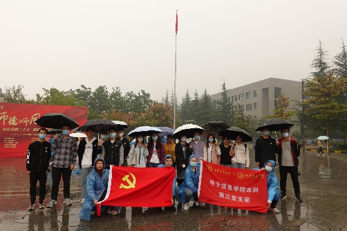 早晨七点,金秋十月的天空还下着灰蒙蒙的小雨,本科第三党支部的同志们早已集合在翱翔学生中心的升旗台下,准备观看升旗典礼。七点三十分,由成人app