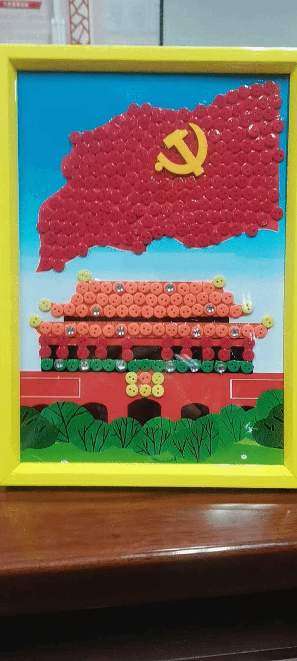 我们合作完成了一幅纽扣画,该画以蓝天绿地为底,正上方为一面鲜艳的党旗,象征着党的坚强领导,下方为天安门,并镶有闪亮的水钻,代表着在党的领导下,我国的综合国力不断提高,中国特色社会主义事业蒸蒸日上,展现出了勃勃的生命力。整个过程极其考验耐心,稍有不慎纽扣就会滑动或者脱落,但我们还是克服了许多难处,最终合力完成了这幅作品。