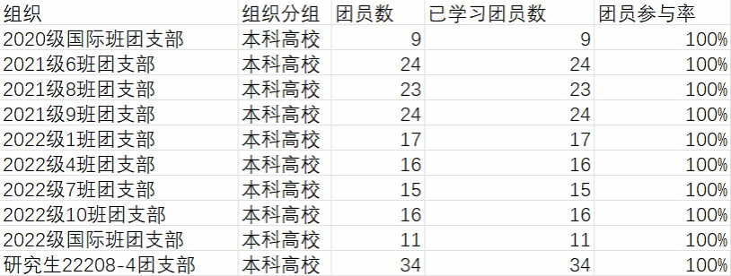 但部分团支部团员参与率较低,尤其是毕业年级团支部,希望这些支部在之后的学习中能够提高学习积极性,加强思想建设,向完成率较高的团支部汲取经验,按时完成学习任务。