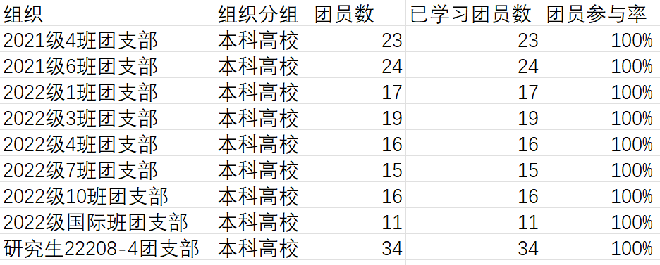但部分团支部团员参与率较低,尤其是毕业年级以及个别研究生团支部,希望这些团支部在今后的学习中能提高学习积极性,积极主动地参与到青年大学习中去,按时完成团支部内的学习任务。