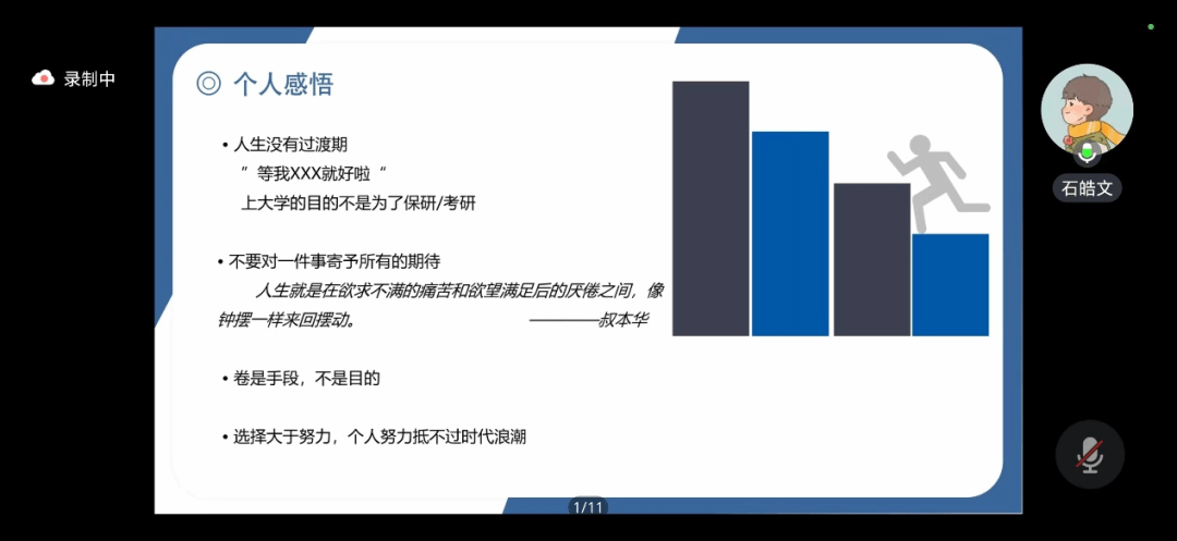 2020级本科生目前的保研情况、不同专业的保研率以及获得保研资格的方法,再以学生角度从学习、竞赛、科研三个方面展开分享自己的经验。最后他分享了他的个人感悟,告诉大家人生没有过渡期,上大学的目的不是为了保研考研,告诉大家要在学习的同时感悟自己的大学生活。