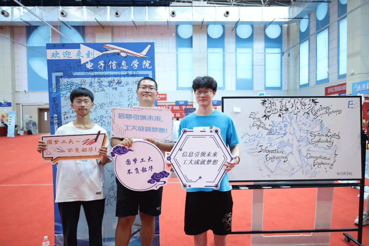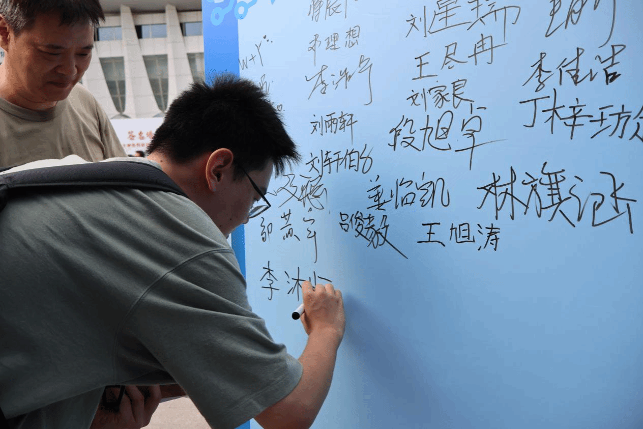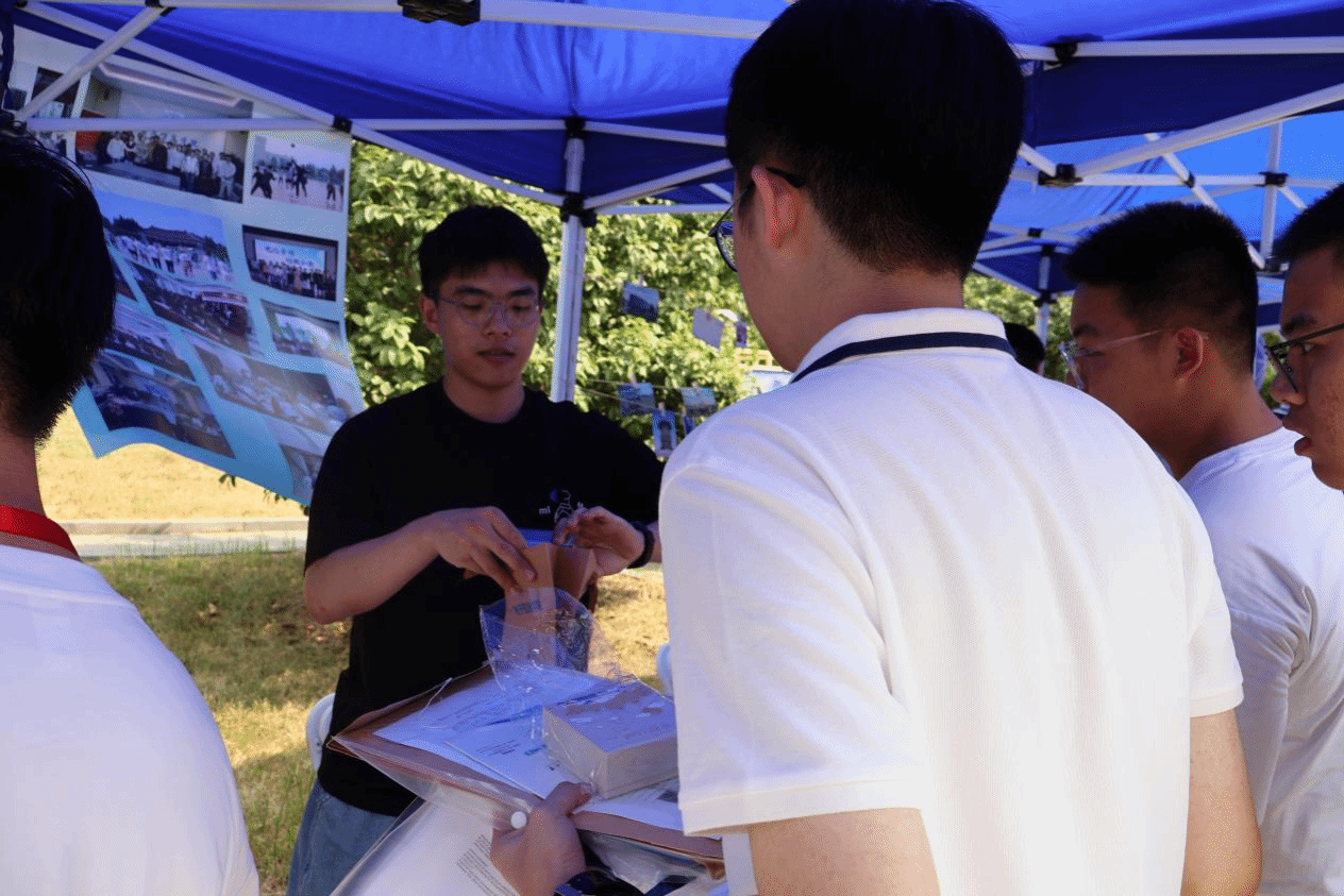 纵使骄阳似火,负责外场迎新工作的志愿者们依旧耐心地为小萌新们讲解报到流程,指引方向,热情地解答大家的疑惑,分发学院为大家精心准备的迎新礼物。此外,学院特定为新生们定制了签名墙,以供大家进行合影留念,希望让新同学留下一段温暖而难忘的回忆。