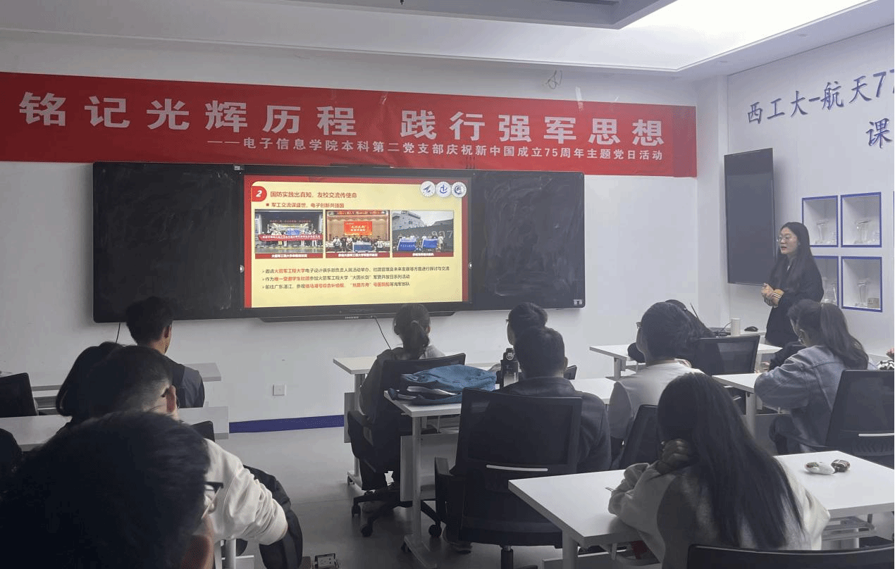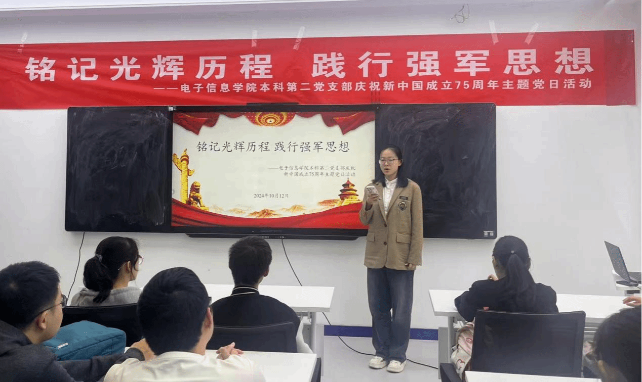 本科第二党支部在学院236会议室开展了“铭记光辉历程 践行强军思想——庆祝新中国成立75周年”主题党日活动。本次活动由宣传委员时嘉乐主持。