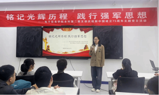 为回顾新中国成立75年来的辉煌历程,深入体会中国人民在中国共产党的坚强领导下,从站起来、富起来到强起来的伟大飞跃,10月12日下午,成人app 本科第二党支部在学院236会议室开展“铭记光辉历程 践行强军思想——庆祝新中国成立75周年”主题党日活动。本次活动由宣传委员时嘉乐主持。