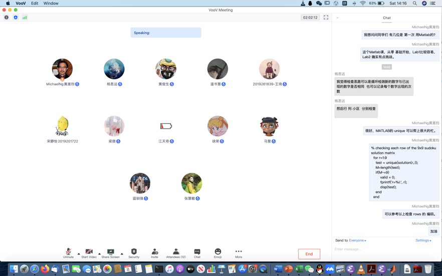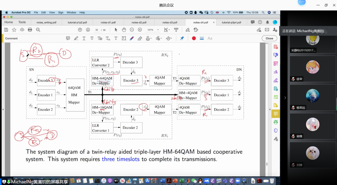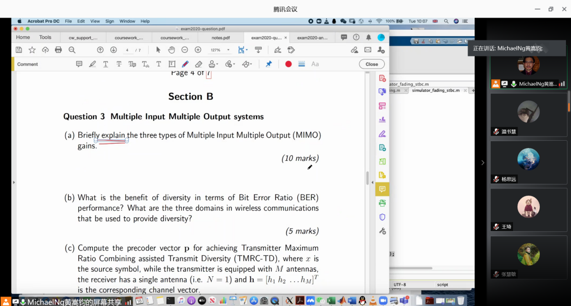 该暑期课程共32学时,Ng教授在腾讯视频会议软件上,进行了为期三周的授课,授课时间为下午4:00到5:40及晚上7:30到9:10。该课程主要分为三个阶段:课程讲解、Matlab学习及仿真、考核(作业和考试)及反馈。在课程讲解阶段,Ng教授为了能够让学生系统地学习先进通信系统的基本原理及先进的收发器技术,将授课内容分为6大部分:1)天线及波的传播;2)无线信道及信道容量;3) 数字调制;4)多输入多输出(MIMO)系统;5)信道编码;6)协作通信。该阶段,每次课程结尾老师都会询问学生有无问题,对于学生存在的疑问,其都会耐心解答。在Matlab学习及仿真阶段, Ng教授留给学生充分的时间进行仿真,并且每间隔15分钟询问学生的进度情况及有无问题,对于学生提出的问题,老师会耐心地进行讲解及演示。在考核及反馈阶段,考核主要采用两种形式:课程作业(Matlab仿真)、线上考试(通信系统基本原理及先进收发机),考核试题均为英文,反馈主要就学生的作业及考试情况,对题目进行讲解。