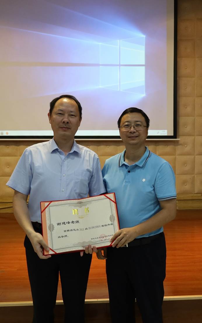 2020级4班校外班级导师聘任仪式。彭亮为谢建峰总经理颁发聘书。