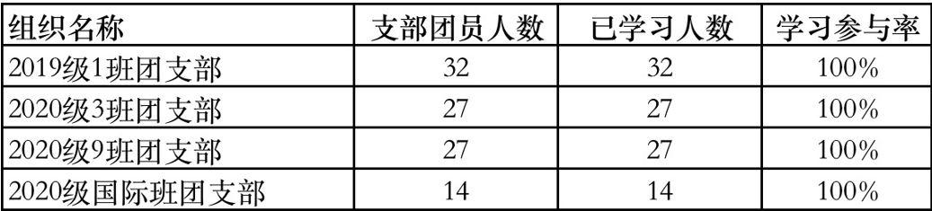 团委各支部积极贯彻落实学校相关要求,一起学党史,强信念,跟党走。本科支部18级和研究生支部较上期学习参与率有所提升,20级学习参与率全部超过60%;其中,共有4个支部学习参与率达100%,分别是:19级1班,20级3班、9班和国际班,在此对这些团支部提出表扬!