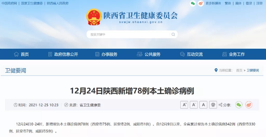 12月24日0-24时,陕西省新增报告本土确诊病例78例(西安市75例、延安市2例、咸阳市1例)。自12月9日以来,全省累计报告本土确诊病例342例(西安市330例、延安市7例、咸阳市5例)本数据来源陕西省卫健委。