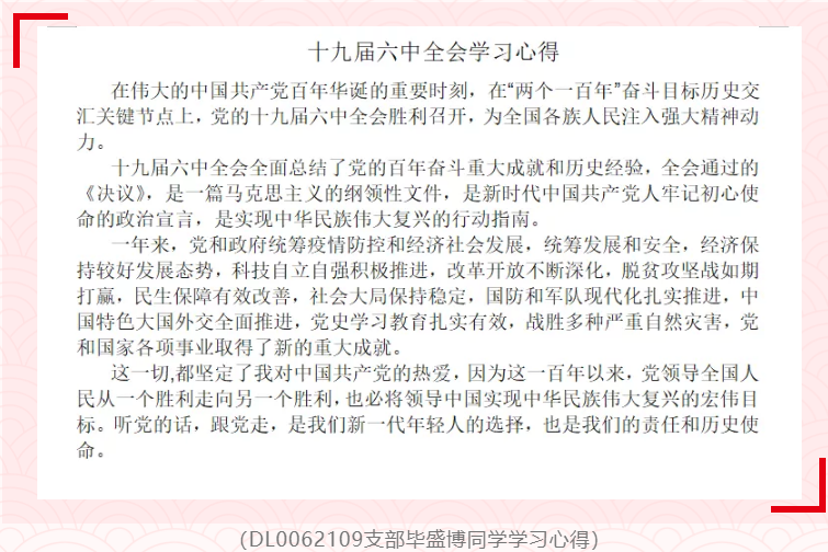 团委紧跟时政热点,及时将学习党的十九届六中全会精神作为11月“学习新思想,争做新青年”主题团日活动重点内容,使广大电信学子第一时间对全会精神有了初步的认识。
