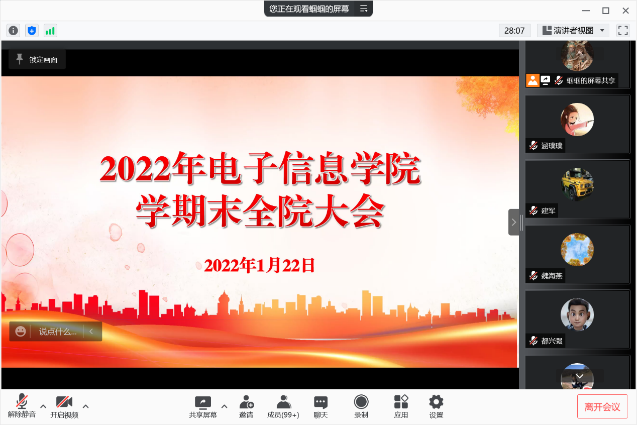 深入贯彻习近平总书记重要指示精神,时刻绷紧思想之弦,按照学校党委要求,统筹做好假期疫情防控和安全稳定工作,落实学生离校、留校各项工作,压实工作责任,确保学生顺利返乡。1月22日,学院线上召开学期末全院大会,大会对寒假学生返乡和留校、年终绩效发放情况以及寒假务虚会安排等工作进行通报部署,全体教职工参加了此次会议,会议由党委书记侯俊主持。