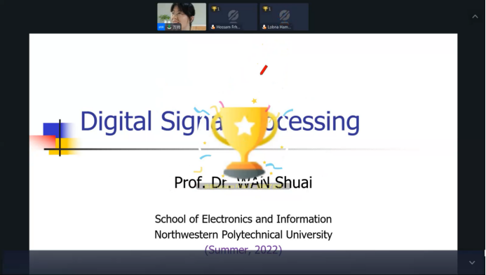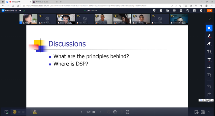 “学在工大——全球暑期开放课堂”项目。在国际教育学院的指导下,经过前期精心筹备,学院根据学科特点和专业特色,围绕前沿研究专题,于7月9日-7月21日面向海外学生开设了全球暑期开放课堂——《Digital Signal Processing》(数字信号处理),课程由万帅教授主讲,张易凡副教授担任助教。本课程主要通过全球融合式教学平台(OMO)进行线上授课,辅以Quizizz平台进行互动测试,受到海外知名高校学生欢迎,吸引了来自俄罗斯、埃及等多个国家的学生在线参与学习。