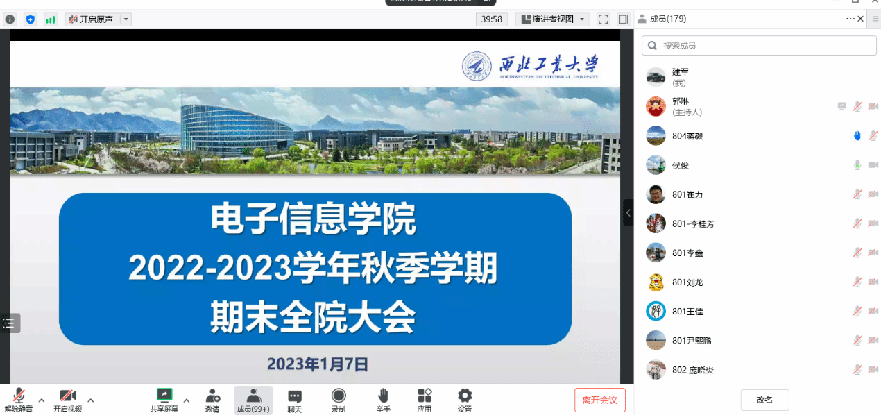 随后,侯俊通报了教育部和陕西省近期公布的违反教师职业行为十项准则典型案例,以案示警,要求全院教职工要引以为戒,牢固树立底线意识,切实增强遵守教师职业行为十项准则的思想自觉和行动自觉,坚守为党育人、为国育才的初心。最后,他强调,一是学校即将进入寒假假期,全院教职工要做好假期安全相关工作,加强实验室管理,责任到人,谨防安全隐患事故的发生;二是要加强学生管理,跟踪掌握离校返乡学生的实际情况,关心关爱留校学生,确保在校正常生活学习;三是要严格落实八项规定,廉洁过节。并再一次感谢全院师生辛勤工作和付出,预祝大家新春快乐,身体健康!