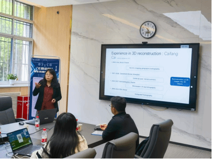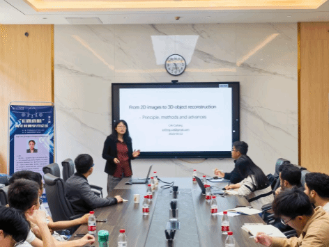 随后,蔡彩芳做了题为《From 2D images to 3D object reconstruction》的报告。介绍了所在团队的主要研究方向及相关研究成果,分析了多种图像分割算法以及图像分割准确度对后续建模的影响,阐述了相关算法的内涵以及如何从二维图像中快速提取有效信息,以便实现二维数据到三维数据的快速融合。二维图像信息通过边界融合可以构造三维图像的完整曲面,从曲面结构再产生三维结构。三维结构信息可以应用于无损检测以及数据融合等多种应用场景。
