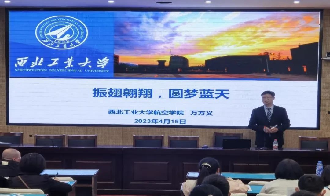 随后,副院长万方义为镇海中学200多名学生与家长做了《振翅翱翔,圆梦蓝天》的科普讲座。万方义从什么是飞机、飞机为什么会飞、航空科技发展、中国的大飞机历程、飞机设计师的摇篮-西工大等方面阐述了西工大在中国航天史上的重要作用,学生和家长认真聆听,现场氛围活跃、掌声不断。