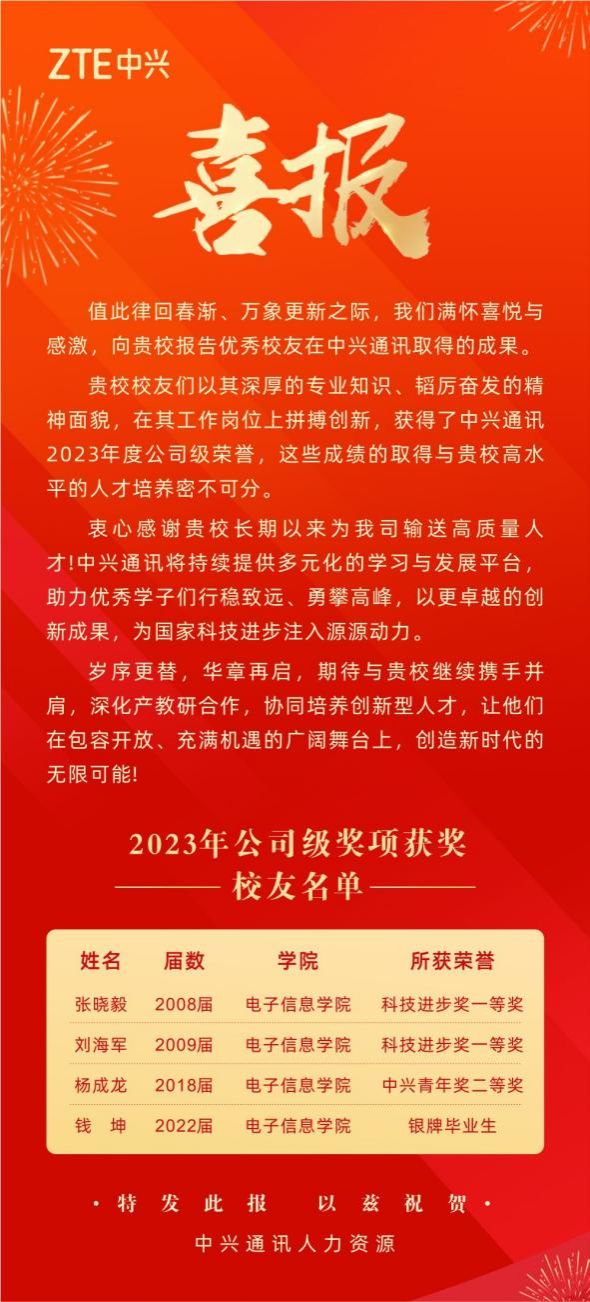 近日,中兴通讯向我校发来喜报,共有16名校友获得中兴通讯2023年度公司级荣誉,其中有4名校友毕业于成人app