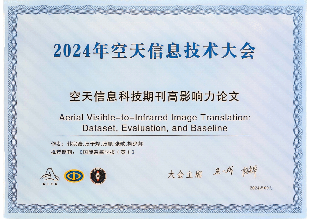 梅少辉教授作为通信作者的论文《Aerial Visible-to-Infrared Image Translation: Dataset, Evaluation, and Baseline》荣获“空天信息科技期刊高影响力论文”,全国共14篇论文入选。
