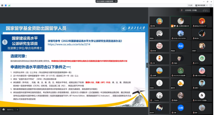 召开研究生赴国(境)外交流项目线上宣讲会,学院国际化秘书王秋霞老师详细介绍了研究生赴国(境)外交流的相关项目政策及流程办理,学院硕博各年级近百名学生线上参会。