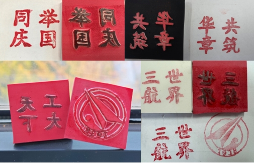 随后,由我校学生雕刻协会负责人王皓然讲授橡皮章雕刻技巧。王皓然同学从制作实践出发,深入浅出地讲解了雕刻的基本原理、执刀手法、雕刻技巧等内容,并以“中”字为例为同学们演示雕刻过程,并鼓励大家要科学操作,也要敢于实践。随后,同学们按照讲解内容进行练习体验,利用橡皮章刻制了“共筑华章”“盛世中华”“国泰民安”“天下工大”“世界三航”等内容。